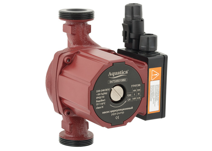 Насос циркуляційний енергозберігаючий 45Вт Hmax 6м Qmax 50л / хв Ø1½ 180мм + гайки Ø1 AQUATICA (774136). У порівнянні з традиційними циркуляційними насосами даний насос має дуже низьку витрату енергії. Відповідає класу енергозбереження А за європейським стандартом і в залежності від режиму роботи витрата енергії може знижуватися до 5 Ватт. Корпус насоса чавунний; вал двигуна - кераміка; робоче колесо: технополімер. Електродвигун: асинхронний, безшумний; обмотки статора: мідь; гільза статора електродвигуна: нержавіюча сталь AISI 304; підшипник: керамічний радіальний; Напруга: 220-240 В; Частота: 50 Гц; Клас ізоляції: Н; Клас захисту: IP44. Умови застосування: максимальна температура перекачується рідини: +110 ºC; максимальна температура навколишнього середовища: +40 ºC; тиск в системі: до 10 бар; тільки для чистої води без піску, глини, вапна і т.д .; pH 6.5 - 8.5; загальна мінералізація води: не більше 1500 г / м³. Термін гарантійного обслуговування: 18 місяців.
