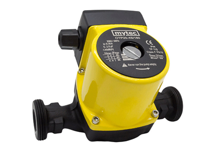 Насос циркуляційний Mytec OTP 4/25S 180. Полімерна крильчатка, безшумна робота, керамічний вал, мідна обмотка статора. Насоси цієї серії призначені для перекачування чистої води. Широко застосовуються для циркуляції води в центральних і зональних системах опалення, у системах кондиціонування повітря і системах гарячого водопостачання. Корпус: чавун з антикорозійним обробленням. Робоче колесо: технополімер. Тип електродвигуна: асинхронний, трьохшвидкісний, безшумний. Обмотка статора: мідь. Гільза статора електродвигуна: нержавіюча сталь AISI 304. Підшипник: керамічний радіальний. Напруга: 220-240 В. Частота: 50 Гц. Клас ізоляції: Н. Клас захисту: IP44. Вал двигуна: кераміка. Висота подачі – 6м, діаметр підключення – 11/2 дюйма, довжина бази – 180, продуктивність – 46л/хв., вага – 2,8кг, потужність 0,1кВт.