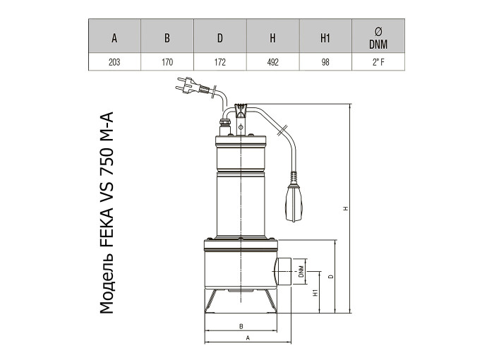 Насос фекальний DAB FEKA VS 750 M-A з вихровим робочим колесом з корозійностійкої сталі призначений для перекачування стічних і каналізаційних вод. Експлуатаційні вимоги дозволяють присутність у робочій рідині твердих частинок діаметром до 5 см. Пристрій забезпечений однофазним асинхронним електродвигуном. Охолодження двигуна — водяне. Насос має бути встановлений вертикально, зафіксовано або вільно. Переносна ручка — з ізолювальним гумовим покриттям.