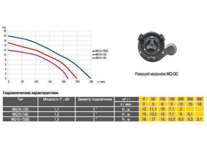 Корпус насосної частини і робоче колесо виготовлено з чавуну. Надійність елементів ущільнювачів фекального насоса повністю ізолює електродвигун від контакту з рідиною, що перекачується і захищає від надлишкових тепла і вологи. Наявність таких особливостей, як подвійне торцеве ущільнення валу в маслозполненной камері і маслозаповнений двигун, гарантують охолодження насоса навіть у разі його занурення в рідину менш ніж на половину. Робоче колесо з ріжучим механізмом дозволяє подрібнювати різноманітні відходи, які транспортуються зі стічними водами-шматки тканини, шнури і ін. Також насос обладнаний поплавковим вимикачем, що забезпечує роботу насоса в автоматичному режимі. Напруга мережі: 230V - 50Hz. Термозахисне реле вбудоване у виносний блок.