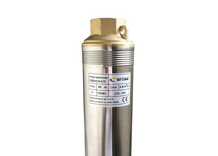 OPTIMA 3.5SDm2 / 16 0.75 кВт 90м оснащений асинхронним однофазними двигуном з коротко замкнутим ротором і «плаваючим» робочим колесом, для реалізації підвищеної стійкості до піску. Насос комплектується вбудованим в пульт теплової захистом, а також конденсаторним блоком. Двигун заповнений спеціальним мінеральним маслом для ефективного охолодження (тепловіддачі в навколишнє середовище), а також для змащення й охолодження підшипників і механічного ущільнення.
