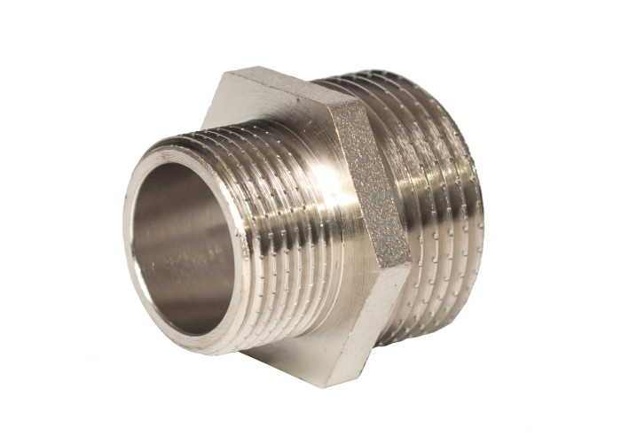 Ніпель латунний різьбовий редукційний, розмір 1" х 3/4" дюйма з нікелевим покриттям, зовнішня-зовнішня різьба. Латунні різьбові фітинги RSk використовуються для створення роз’ємних різьбових з'єднань на трубопроводах холодного, питного, господарського та гарячого водопостачання і опалення. Особливість фітингів даного виробника – використання для їхнього виробництва високоякісної нікельованої латуні CW617N. Фітинги РСк застосовуються на трубопроводах, виконаних з різних матеріалів (сталь, мідь, латунь, поліпропілен, металополімер). Їхній великій популярності серед покупців і монтажників сприяє не тільки їхня висока якість і надійність, але і широкий асортимент запропонованих фітингів, який постійно поповнюється. Бренд RSk пропонує латунні різьбові муфти, трійники, кутники, згони, хрестовини, ніпелі, заглушки, футорки, перехідники, а також хромовані подовжувачі різних розмірів і типомоделей. Важливо, що вся продукція RSk має необхідні сертифікати та дозволи для експлуатації в Україні.