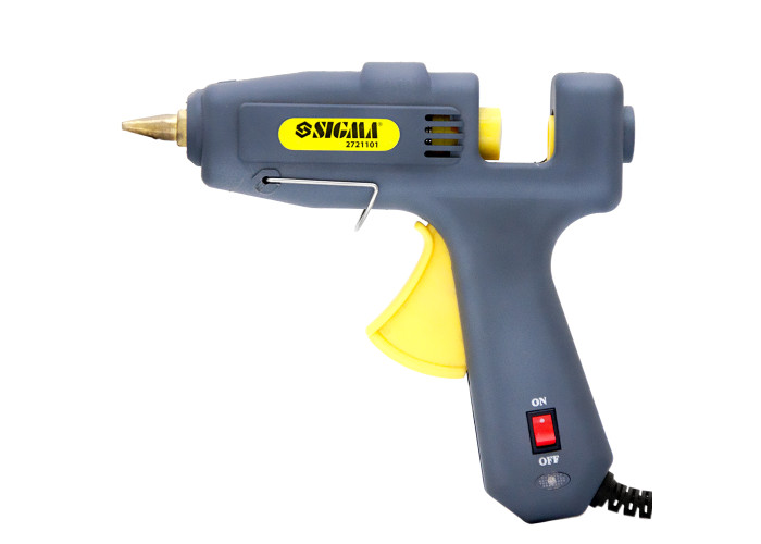 Пістолет термоклеевой з вимикачем 100 Вт Sigma (2721101) призначений для склеювання кераміки, паперу, картону, пластмаси, дерева і металу. Дуже добре підходить для вирішення завдань різного ступеня складності. Особливості: робоча температура 190-230ºC; вимикач на корпусі дозволяє, не відключаючи пістолет з мережі, робити перерви в роботі; мережевий індикатор на ручці точно показує надходження живлення; пластик високої якості, під час експлуатації не деформується під впливом температур; конструкція пістолета оснащена захистом від висмикування шнура; сопло пістолета виготовлено з латуні; встановлений клапан-запобіжник запобігає мимовільне витікання клею; надійна лита конструкція камери нагрівального елементу виготовлена з якісного матеріалу і не виходить з ладу при впливі температур; висока продуктивність. Перед початком роботи вставте клейовий стрижень в отвір розташоване з тильної сторони пістолета. Підключіть обладнання до мережі, переконайтеся що індикатор на ручці загорівся.