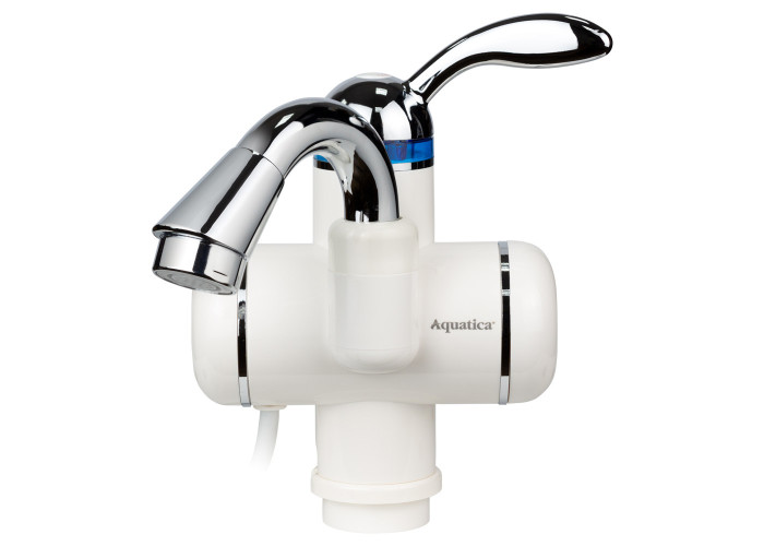 Кран-водонагрівач проточний LZ 3.0кВт 0,4-5бар для раковини, гусак вигнутий, на гайці AQUATICA (LZ-5A111W) Клас захисту: IPX4. Мінімальний тиск в системі водопостачання: 0.4 бар. Максимальний тиск в системі водопостачання: 5 бар. Водневий показник води (pH): 6.5-8.5. Загальна мінералізація води: не більше 1500 г/м³. Тільки для чистої води без домішок, що містять абразиви (пісок, глину, вапно тощо). Проточний водонагрівач Акватика LZ-5A111W є кран з автономним підігрівом холодної води. Чудово підходить для використання на дачі, в квартирі, побутових приміщеннях офісних будівель. Відмінно замінює газову колонку або бойлер. Кріпиться на раковину за допомогою гайки, а також підключається до мережі з напругою 220 В. Цей проточник складається з білого термостійкого корпусу з нагрівальними елементами. Регулювання температури і напору струменя здійснюється за допомогою важеля. Вилив короткий, вигнутий, на виході встановлено аератор для насичення потоку киснем і утримання вапняних відкладень. Переваги: постійний доступ до гарячої води; займає мінімум місця; привабливий дизайн; зручне управління однією рукою; захист від попадання вологи всередину корпусу. Гарантія на кран водонагрівач проточний електричний LZ-5A111W - 12 місяців.