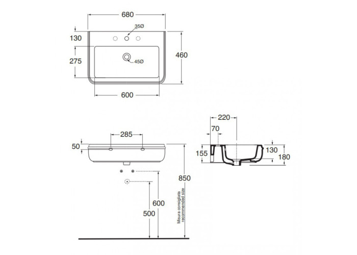 Раковина Azzurra Charme CHA268B1 виконана у формі прямокутника з округленими передніми кутами. Передбачено отвір для змішувача, отвір для переливу і пристінний борт, на якому можна розмістити ванне приладдя. Рекомендуємо додатково придбати керамічний донний клапан для перекриття зливного отвору у разі потреби.