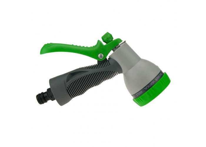Так само з ним в наборі поставляється пістолет розпилювач для поливу. Він зроблений з міцної пластмаси і відрізняється високою функціональністю. У нього сім режимів роботи при можливості контролювати натиск води. Якщо під час процесу рука втомилася тримати спусковий важіль, його можна зафіксувати в робочому положенні металевої шпилькою.