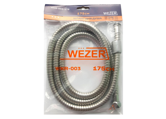 Шланг для душу WEZER, довжина 175 см, упаковка – пакет. Спеціальний внутрішній шланг з матеріалу PVE та EPDM пропускає воду з тиском 400 PSI і з температурою 80˚С, при статичному випробуванні не рвуться. У конструкції використовується передова німецька технологія, при якій подвійний затиск не дає з’єднанню розірватися. Обплетення з високоякісної нержавіючої сталі 304.