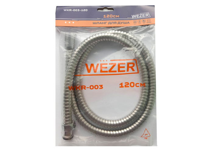 Шланг для гігієнічного душу WEZER, довжина 120 см, упаковка – пакет. Спеціальний внутрішній шланг з матеріалу PVE та EPDM пропускає воду з тиском 400 PSI і з температурою 80˚С, при статичному випробуванні не рвуться. У конструкції використовується передова німецька технологія, при якій подвійний затиск не дає з’єднанню розірватися. Обплетення з високоякісної нержавіючої сталі 304.