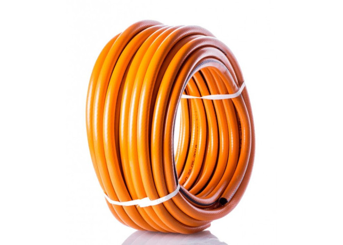 Длина 25 метров и небольшой вес бухты 4,4 кг, позволяют без проблем передвигаться по участку во время полива. Шланг имеет оранжевый цвет с черной полосой. Преимущество такого типа шлангов заключается в возможности использования при высоком давлении воды.