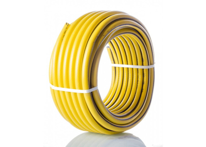 Длина 25 метров и небольшой вес бухты 4,4 кг, дают возможность без труда перемещаться по территории полива. Покрытие зеленого цвета с желтой полосой защищает внутренние шары от загрязнений и повреждений. Еще одно преимущество такого вида шлангов, заключается в возможности использования при высоком давлении воды.