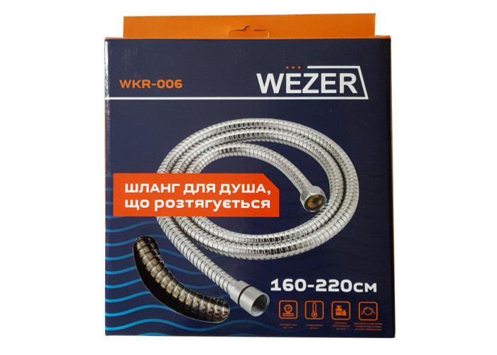 Шланг розтяжний для душу WEZER, підшипник, покриття хром, довжина 160-220 см, упаковка – картонна коробка. Спеціальний внутрішній шланг з матеріалу PVE та EPDM пропускає воду з тиском 400 PSI і з температурою 80˚С, при статичному випробуванні не рвуться. У конструкції використовується передова німецька технологія, при якій подвійний затиск не дає з’єднанню розірватися. Обплетення з високоякісної нержавіючої сталі 304.
