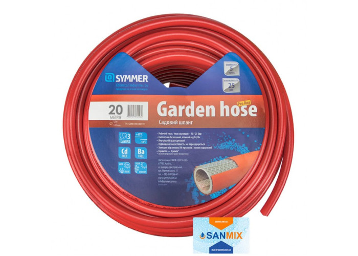 Шланг садовий Symmer PRO Line D 1/2 "20 м відрізняється великою температурною стійкістю і зносостійкість. Він безпечний для людини, оскільки в його складі не міститься таких шкідливих для здоров'я людини речовин як барій і кадмій. Внутрішній харчової шар садового шланга Сіммер не виділяє в воду шкідливих речовин. Зовнішній - має підвищену стійкість до руйнівній дії ультрафіолету. Армування ниткою не тільки скріплює полімер, а дає можливість рівномірно розподілити тиск по всій довжині вироби. Також в ньому не розвиваються водорості.