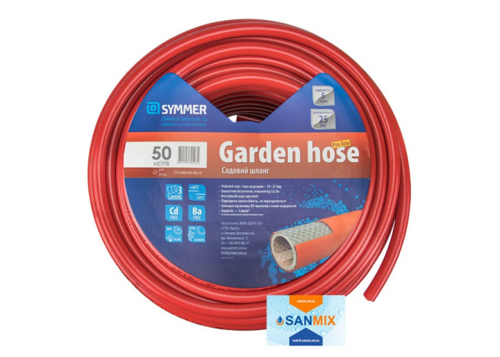 Шланг садовий Symmer PRO Line D 3/4 "50 м має велику довжину, тому дозволяє дотягнутися до віддалених ділянок саду. Завдяки своїй гладкій структурі і еластичності в ньому сила напору майже не втрачається. Варто відзначити його тришарову армовану структуру, стійку до зламів і перекручення . у шлангу для поливу Symmer серії PRO Line не розвиваються водорості. Верхній шар перешкоджає руйнуванню вироби під дією УФ-випромінювання. А екологічно чисті складові не містять в складі важких металів (Cd, Ba).
