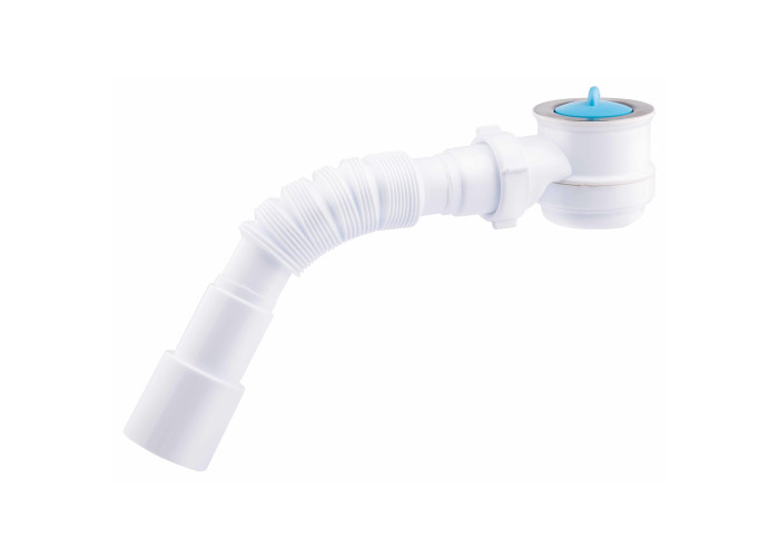 Сифон для низького душового піддона Krono Plast П1000 виконаний з пластику класичного білого кольору, має гладку внутрішню поверхню, що не тільки робить його поцінним, але й перешкоджає накопиченню бруду на стінках. Таким чином, сифон не потрібно часто чистити. Отвір відкривається або перекривається вручну за допомогою пробки для зливу. Наявність гофрованої труби дає можливість змінювати її довжину і кут під час установки.