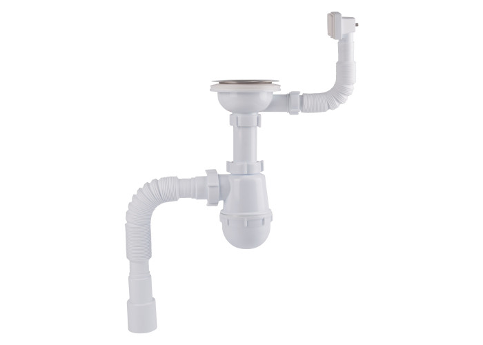 Сифон для кухонної мийки Krono Plast ЕМ1050EURO виконаний з пластику класичного білого кольору, має гладку внутрішню поверхню, що не тільки робить його поцінним, але й перешкоджає накопиченню бруду на стінках. Таким чином, сифон не потрібно часто чистити. Форма колби та мокрий закрив не дають неприємним запахам проникати в приміщення. Прямокутний перелив убезпечить вас від небажаного виходу води за край мийки. Наявність гофрованих труб дає можливість змінювати їх довжину і кут.