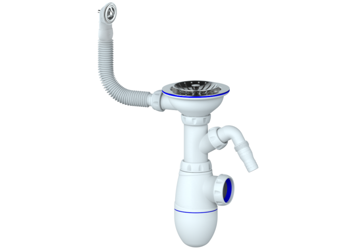 Сифон для мийки Ø115 з виходом до пральної машини та прямокутним виливом UNICORN В431V. Важлива особливість такої моделі полягає в тому, що гумові ущільнювачі контрастного синього кольору вже інтегровані в корпус сифона завдяки використанню багатокомпонентного лиття (технологія Multi-Injection). Це значно прискорює його монтаж і мінімізує ймовірність протікань. Сифон часто наражається на небезпеку з боку механічних пошкоджень під час експлуатації. Щоб максимально мінімізувати такі ризики, в моделі реалізовано практику Increased Strength (підвищена міцність), спрямовану на виготовлення ущільнювачів з термоеластопласту, що забезпечує додаткову щільність і міцність, а також використовується високоміцний пластик, з якого зроблений корпус. Схема та інструкція з монтажу зображена на упаковці, а чашка сифона поставляється в зібраному вигляді, що полегшує і пришвидшує монтаж сифона. Гарантія – 12 років.