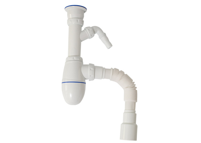 Сифон для мийки зі з'ємним випуском 11/2" з виходом для пральної машини та гофроз'єднанням Ø40 х Ø40/50 UNICORN B320V. Важлива особливість такої моделі полягає в тому, що гумові ущільнювачі контрастного синього кольору вже інтегровані в корпус сифона завдяки використанню багатокомпонентного лиття (технологія Multi-Injection). Це значно прискорює його монтаж і мінімізує ймовірність протікань. Сифон часто наражається на небезпеку з боку механічних пошкоджень під час експлуатації. Щоб максимально мінімізувати такі ризики, в моделі реалізовано практику Increased Strength (підвищена міцність), спрямовану на виготовлення ущільнювачів з термоеластопласту, що забезпечує додаткову щільність і міцність, а також використовується високоміцний пластик, з якого зроблений корпус. Схема та інструкція з монтажу зображена на упаковці, а чашка сифона поставляється в зібраному вигляді, що полегшує і пришвидшує монтаж сифона. Гарантія – 12 років.