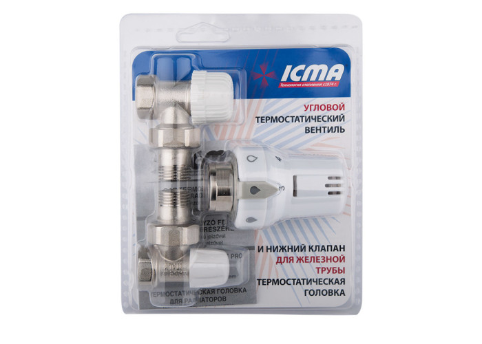 Термостатичні вентилі застосовуються в багатьох традиційних системах опалення на основі рідкого теплоносія, для можливості регулювання протоку теплоносія по системі, з метою регулювання температурного режиму. Термостатичний комплект ICMA KTE985775815AD складається з: термостатичною головки (артикул 985) різьблення М28х1,5, терморегулюючого вентиля (артикул 775) різьблення 1/2 "і кутового нижнього клапана (артикул 805) різьблення 1/2".