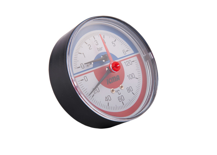 Манометр Ø63. Радіальне підключення. Шкала 0-4, 0-6, 0-10бар з індикацією максимального тиску. Відповідає нормативам ISPESL. Термоманометри - комбіновані прилади для одночасного вимірювання контролю тиску і температури.Термоманометр конструктивно об'єднує в собі два прилади: манометр і термометр в одному корпусі, має дві шкали - тиск і температури. Комплектується запірним клапаном, що дозволяє знімати термоманометр без зливу системи.