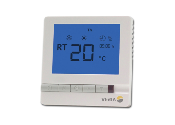 Veria Control T45 - це прогресивний, але простий у вкористанні, цифровий, контрольований таймером термостат з великим цифровим рідкокристалічним дисплеєм, який може використовуватися для контролю за нагріванням вашої підлогиі за допомогою підлогового датчика, кімнатного датчика або комбінації їх обох.