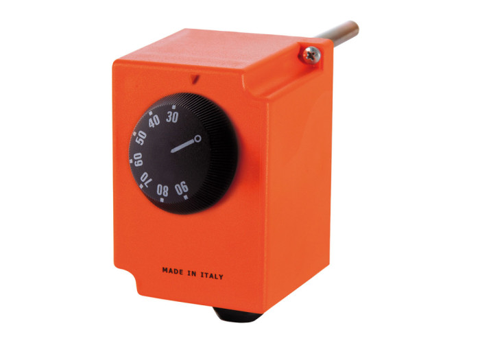 Занурювальний регульований термостат з комутованих контактом. Занурювальний зонд 1/2 ". Довжина 100 мм. Діапазон регулювання робочої температури 0 ÷ 90 ° C. Ступінь захисту IP40. Сила струму контактів 16 (4) A, 230В 50Гц. Диференціал 6 ± 2 ° C. Термостати призначені для подачі або зняття електричної напруги на елементи управління гідравлічних систем в залежності від зміни температури середовища. Термостати можуть управляти роботою насосів, пальників, сервоприводів змішувальних і запірних клапанів, що сигналізує автоматики і т.п., за умови відповідності керованого агрегату технічним характеристикам термостата.