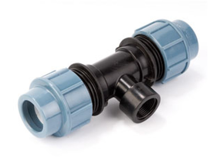 Трійник, внутрішня різьба для поліетиленових труб Ø40 х 1" х 40. Компресійні фітинги застосовуються для створення зовнішніх водопроводів, поливних систем і використовуються переважно для транспортування холодної води. Переваги: доступність за ціною, невелика вага, швидкий і легкий монтаж, що не вимагає додаткових інструментів, можливість створення роз'ємних з'єднань. Номінальна температура для застосування 20˚С, а максимальна робоча температура - до 60˚С в межах робочого діапазону труб. Номінальний тиск залежить від діаметра: для 16, 20, 25, 32, 40, 50, 63 мм воно складає 16 бар, для фітингів 75, 90 і 110 - 12,5 бар відповідно. Компресійні фітинги виробляються відповідно до стандартів UNI, ISO, DIN, NF, різьба відповідно до UNI, а фланцеві з'єднання відповідають вимогам UNI і DIN. Всі фітинги виконані відповідно до загальних технічних умов. Для виготовлення фітингів використовується чорний поліпропілен для корпусу, чорна прокладка з нітрилової гуми, біле затискне кільце з поліацетата і гайка з поліпропілену.