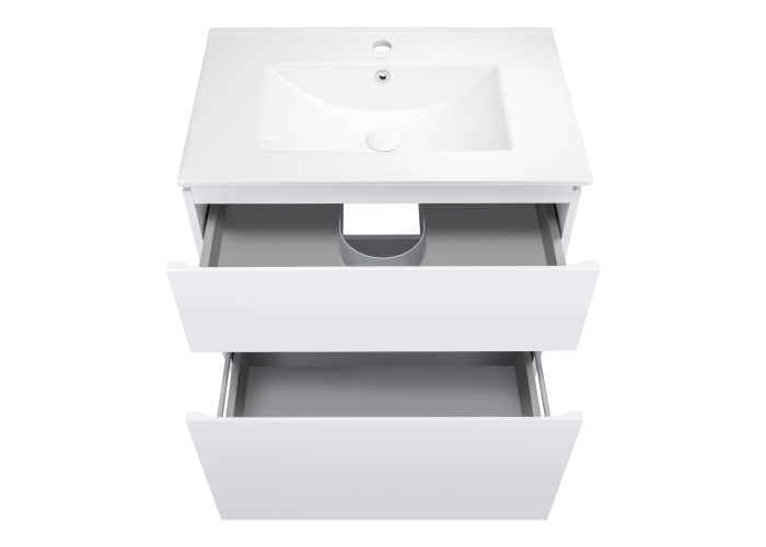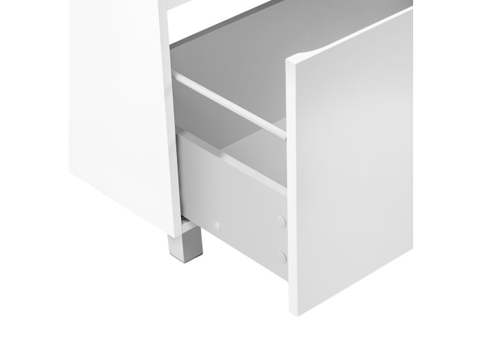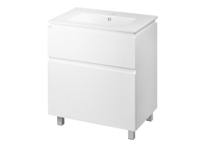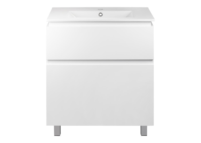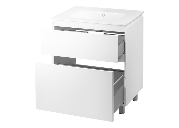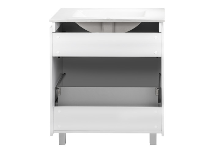Тумба підлогова з умивальником Qtap Albatross QT0171TN700D3070CW виконана з отвором під сифон і переливом. У комплекті чотири хромовані ніжки з пластику. Корпус тумби виготовлено з ДСП, з двошаровою ламінацією білого кольору, фасадна частина з МДФ з глянцевим покриттям. Тумба оснащена двома висувними ящиками з механізмом доведення. Тумба виконана в елегантному лаконічному стилі, який впишеться в дизайн будь-якої ванної кімнати.