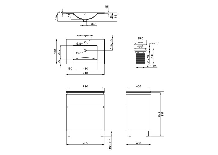 Тумба, дюбель розпірний з L-подібним крюком, силікон, ніжки, паспорт.