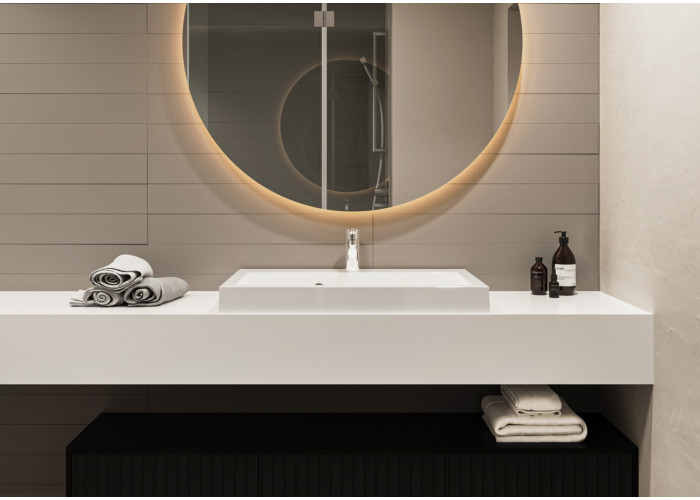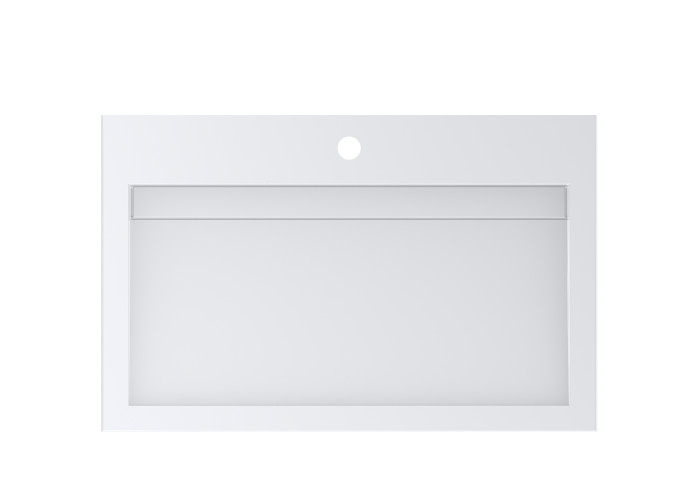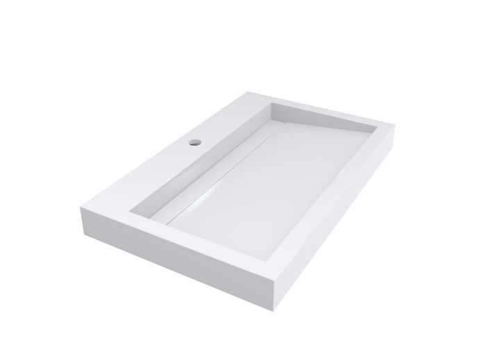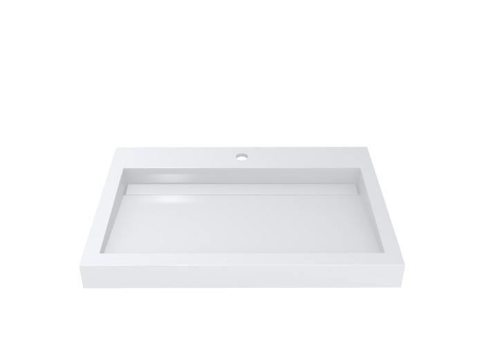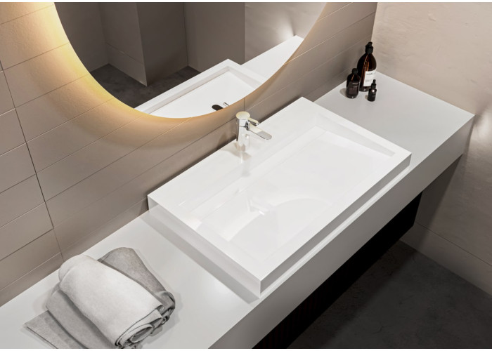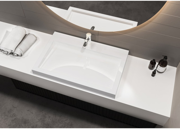 Біла раковина зі штучного каменю має прямокутну форму і лаконічний дизайн з прямими геометричними лініями. Встановлюється на стільницю (накладний тип). По центру знаходиться отвір під змішувач. Переливу немає. Товар комплектується сифоном.
