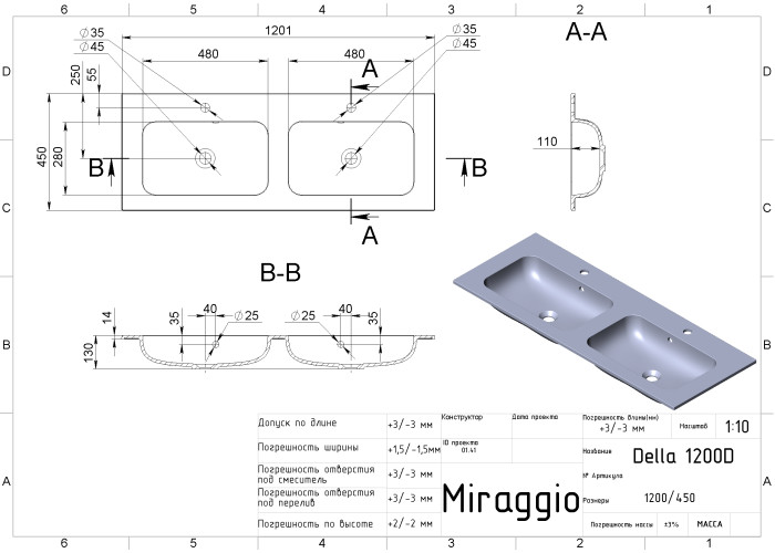 Тип монтажу - врізний. Кожна раковина має свій перелив і отвір під змішувач.