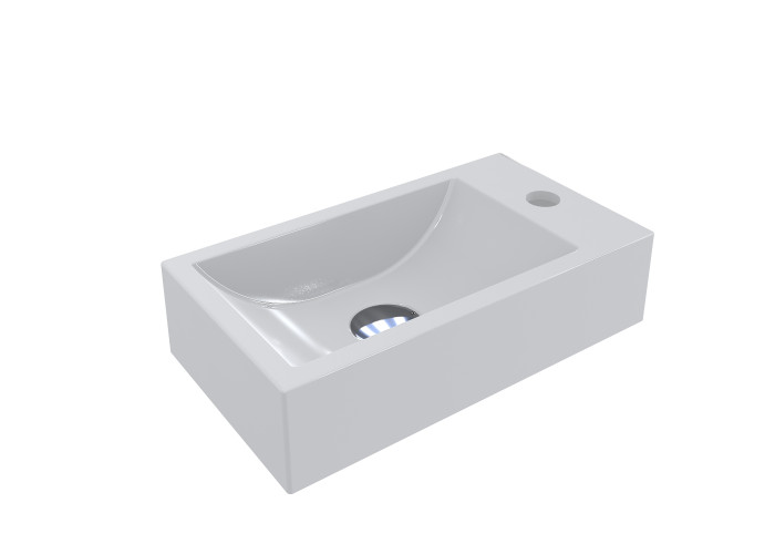 У поверхні раковини передбачено отвір для змішувача. Ви можете поставити невеликий кран, який не буде виходити за межі компактного умивальника. Завдяки похилій внутрішній частині виробу вода не потраплятиме за межі раковини.