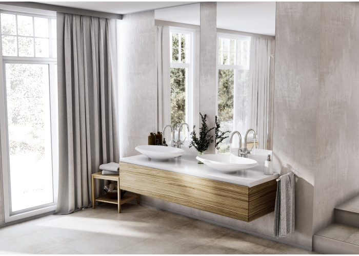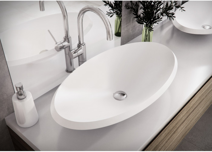 Накладний умивальник Lex R з каменю має антибактеріальну поверхню і витончену овальну форму. Виділяється в інтер'єрі за рахунок нестандартного зовнішнього вигляду і білосніжного відтінку. Матеріали, з яких зроблено виріб, сертифіковані, екологічні та поставляються від європейських виробників.