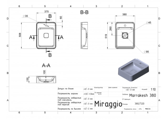 Marakesh 380 виготовлений з литого мармуру (суміш складається на 80% з мінеральної мармурової крихти та на 20% з поліефірної смоли). Цей матеріал покривається додатковим шаром антибактеріального гелю Gelcoat ISO NPG, який робить вироби міцними та білосніжними.