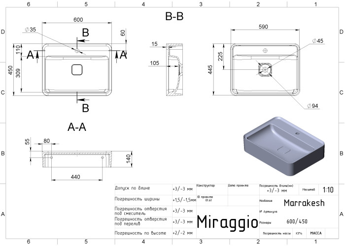 Розмір умивальника 600*450*140 мм, а глибина чаші 105 мм.