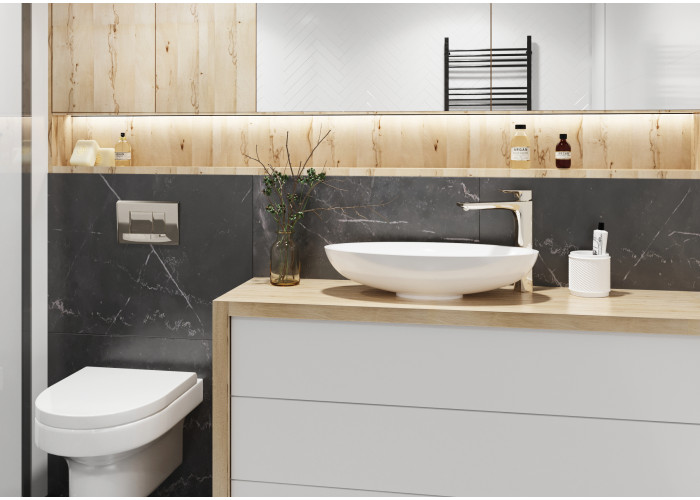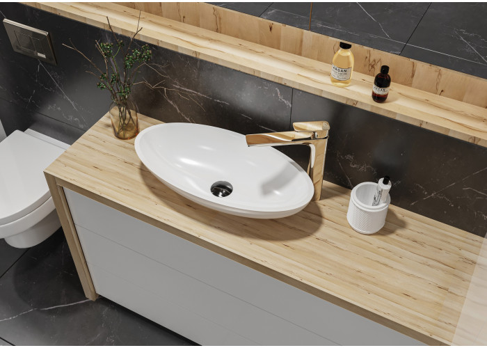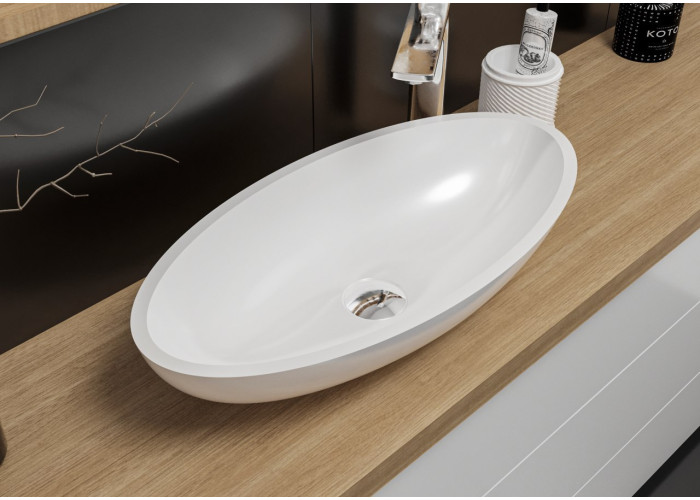 Навіть у ванних кімнатах невеликих розмірів можна розташувати стильний і довговічний умивальник, яким є модель Nice. Він виконаний в еліпсоїдній формі, яка має невелику ширину, але йде в довжину. У такій чаші можна комфортно помити руки і провести інші гігієнічні процедури, а те, що умивальник накладний, спрощує його монтаж і робить установку можливої практично на будь-яку поверхню.