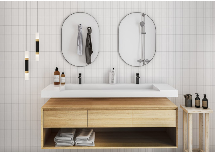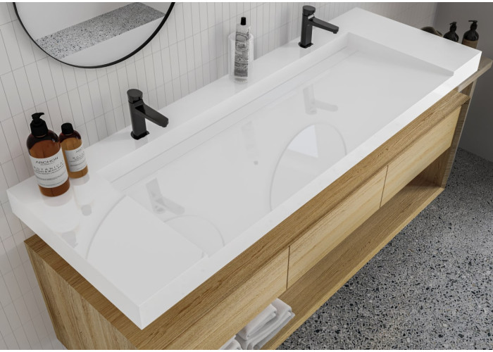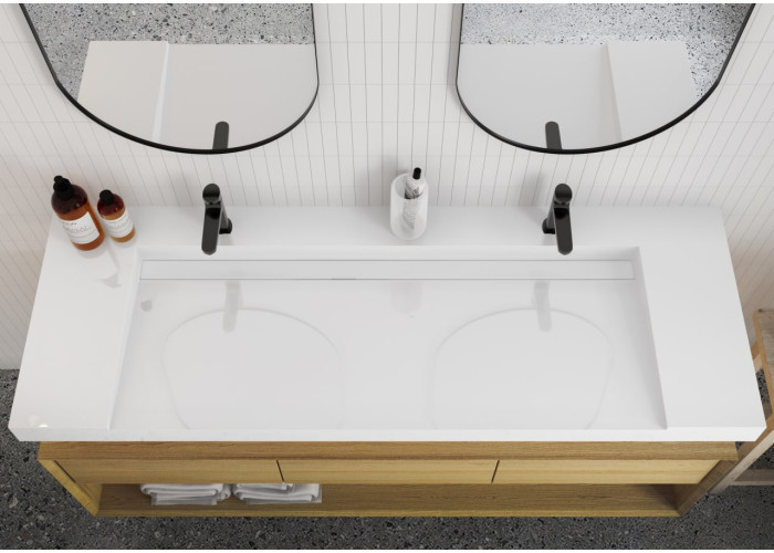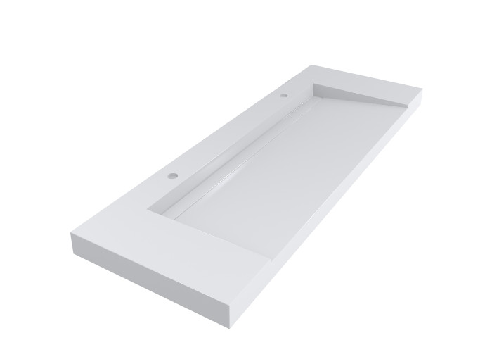 Підвісний умивальник Olmos 1500 виготовлений з литого мармуру за спеціально розробленою технологією. Дана модель доступна з матовим і глянсовим покриттям. Умивальник має прихований злив, сифон поставляється в комплекті. Є два отвори під змішувачі, перелив відсутній.