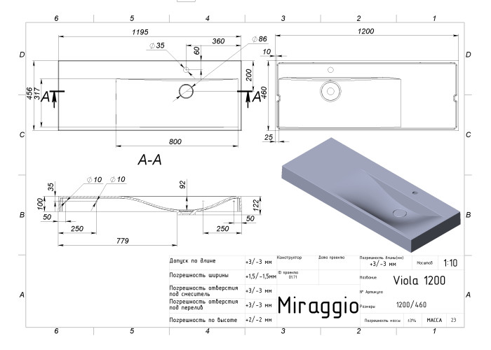 Viola 1200 проводиться з отвором під змішувач, але якщо ваш дизайн передбачає настінний змішувач - ми виготовимо раковину без отворів, ця послуга безкоштовна.