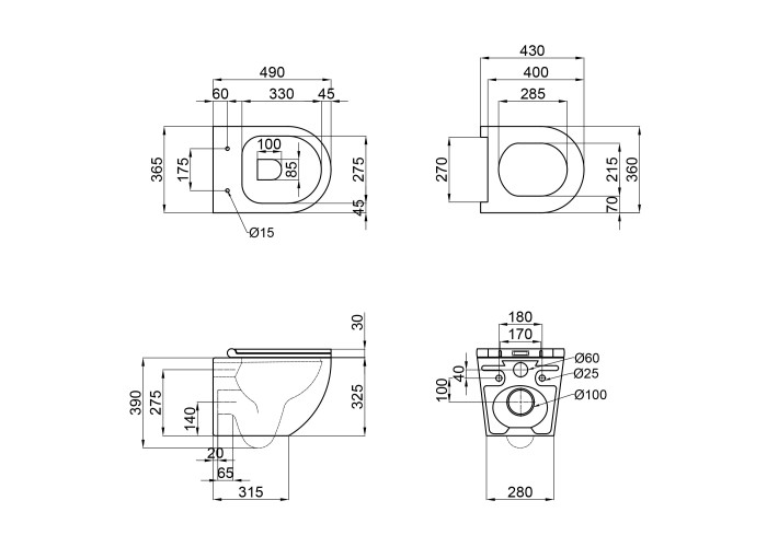 Унітаз: 390х365х490. Сидіння для унітаза: 30х360х430