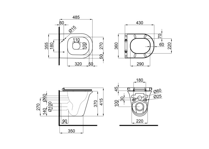 Унітаз: 370х355х485. Сидіння для унітаза: 45х360х430.