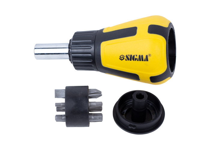 Викрутка з реверсом і двосторонніми битами 6в1 CrV Sigma (4001901) - для монтажу і демонтажу різьбових з'єднань. Викрутка з храповим механізмом ( «тріскачкою»), завдяки якому стрижень з наконечником вільно прокручується в рукоятці в одному напрямку. Така конструкція дозволяє працювати викруткою однієї рукою, не перехоплюючи рукоятку. Залежно від виконуваних функцій (відгвинчування або загвинчування) потрібно змінити напрямок прокручування стрижня. Механізм хропіння забезпечується для цього перемикачем, виконуваних у вигляді важеля, ползункового перемикача або муфти. Середнє положення перемикача блокує обертання стержня в рукоятці.