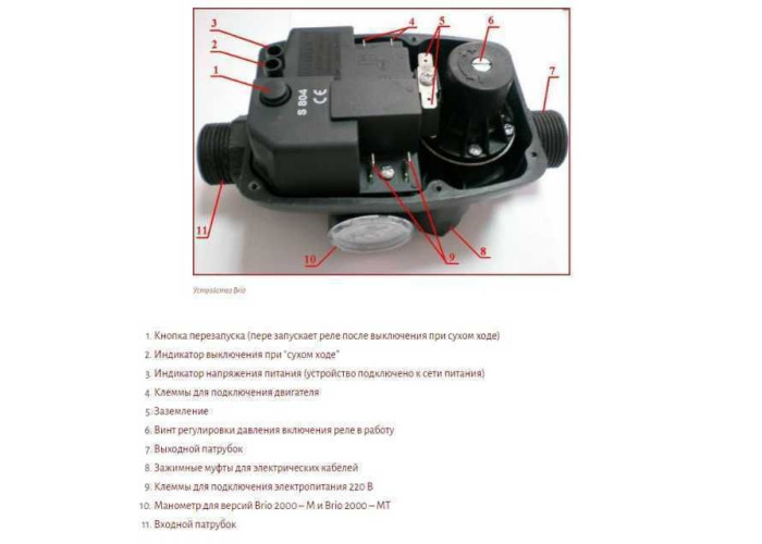 Захист сухого ходу Brio 2000 автомат (з перезапуском) - електронний пристрій управління насосом призначений для автоматичного включення і виключення електричного насоса при падінні тиску (відкритті крана), і підвищення тиску в системі (закриття крана) відповідно.