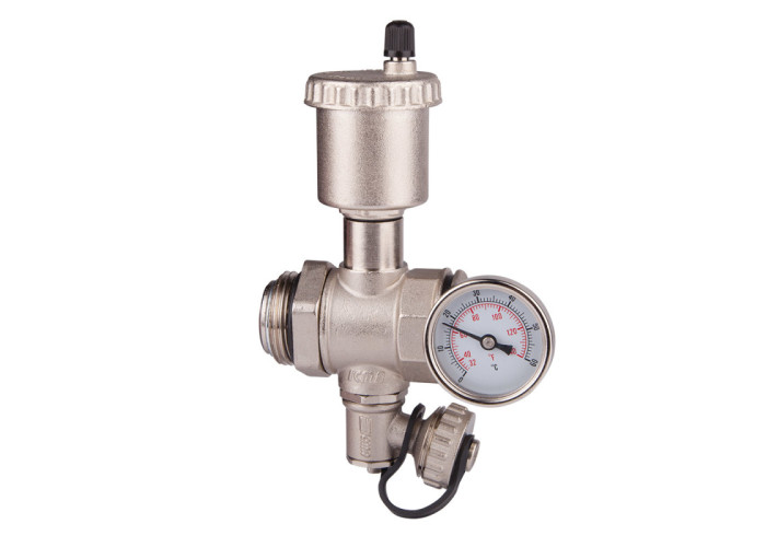 Проміжний фітінг з поворотним приєднанням. Зовнішня - внутрішня різьба. У комплекті з автоматичним відводом повітря, термометром з заглушкою і зливним краном.