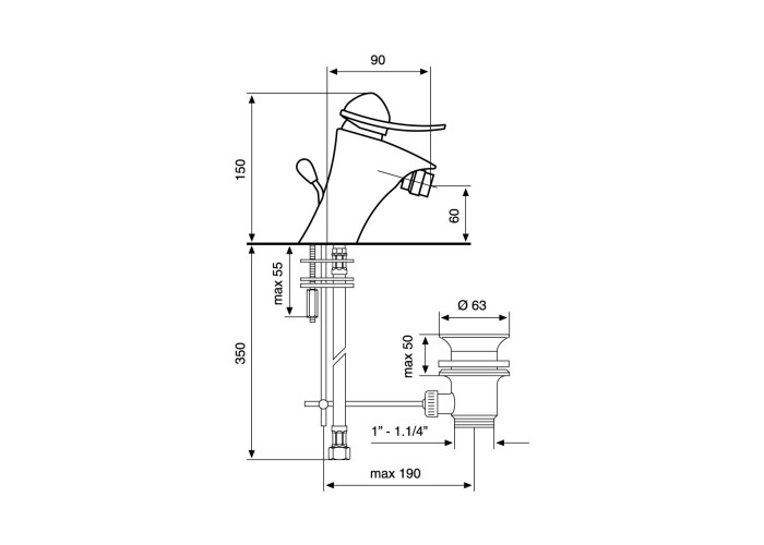 Представлений тут одноважільний настільний змішувач для біде з донним клапаном Cheope SC5004 від Emmevi виготовлений із високоякісної латуні з покриттям кольору матового хрому, має стаціонарний вилив з виносом 9 см. Модель встановлюється на один отвір використовуючи гнучкі шланги для підведення води М10*1/2″.