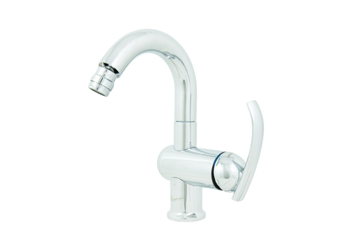 Представлений тут одноважільний настільний змішувач для біде з донним клапаном Ramses CR72074 від Emmevi виготовлений із високоякісної латуні з покриттям кольору хрому, має поворотний вилив з виносом 14.8 см. Модель встановлюється на один отвір використовуючи гнучкі шланги для підведення води М10*1/2″.