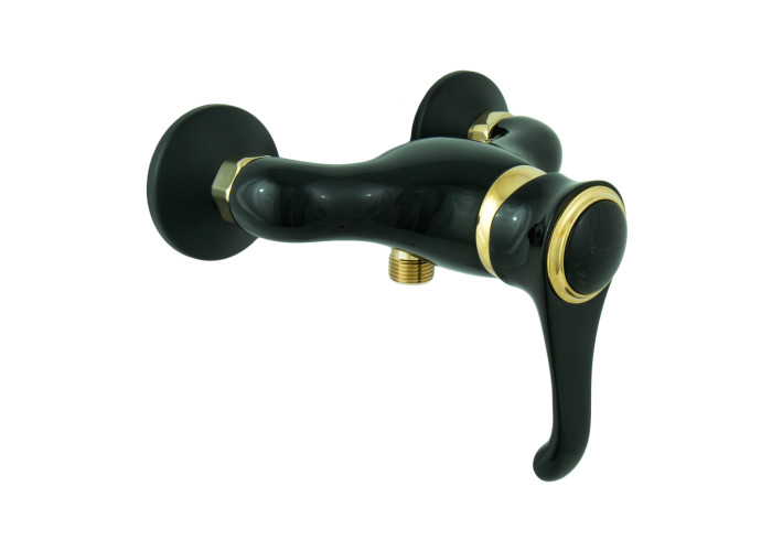 Представлена тут модель настінного, одноважільного змішувача для душу NO6002 серії Tiffany від Emmevi, виготовлена з високоякісної латуні з керамічним картриджем, з покриттям чорного і золотого кольорів, обладнується нижнім відводом для під’єднання душового шланга під діаметр 1/2″, і встановлюється на два отвори за допомогою ексцентрикового з’єднання під діаметр 1/2″.