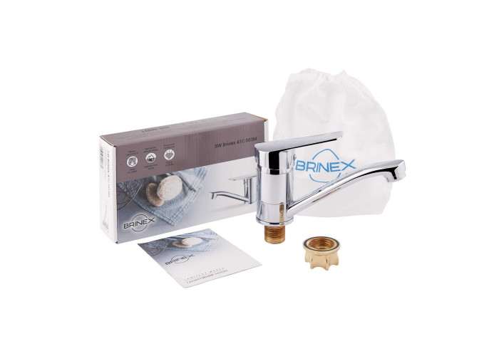 Змішувач для кухонної мийки Brinex 41C 003M виготовлений із металу. Має одноважільне управління, яке регулює натиск холодної та гарячої води. Виконаний в сучасному, стриманому дизайні з глянсовою хромованою поверхнею. Такий змішувач можна назвати універсальним, бо він буде ідеально виглядати в будь-якому інтер‘єрі кухні.