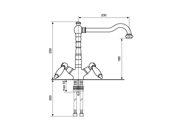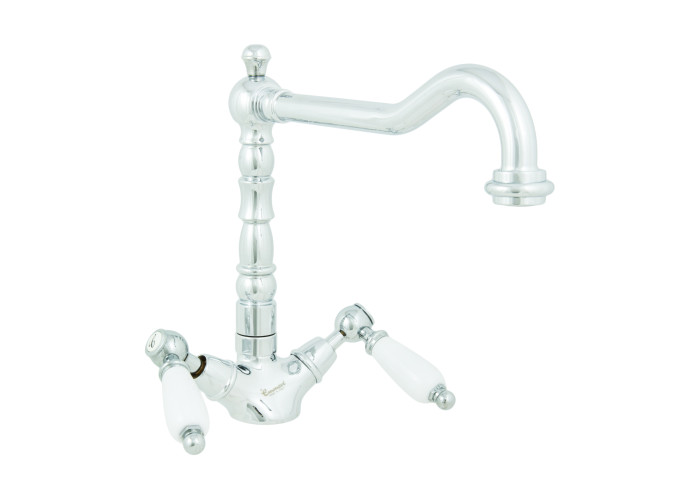 Представлений тут двовентильний, настільний змішувач для кухні Deco-Ceramica CR121617 від Emmevi, виготовлений з високоякісної латуні з покриттям кольору хром, і має поворотний вилив з виносом 23 см. Модель встановлюється на один отвір використовуючи гнучкі шланги для підведення води М10*1/2″.