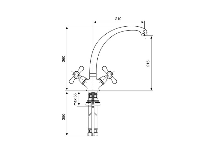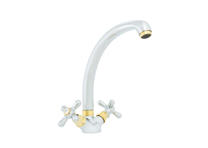Представлений тут двовентильний, настільний змішувач для кухні Deco-Classic CO12717 від Emmevi, виготовлений з високоякісної латуні з покриттям кольору хрому та золота, і має поворотний вилив з виносом 21 см. Модель встановлюється на один отвір використовуючи гнучкі шланги для підведення води М10*1/2″.