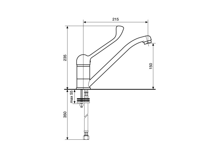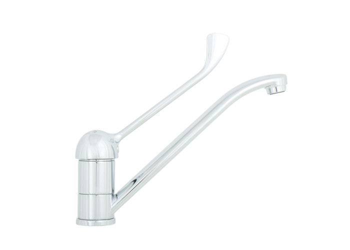 Настільний одноважільний кухонний змішувач із медичною ручкою CR8007 LC серії Giglio від Emmevi має довжину поворотного виливу 21.5 см, обладнується керамічним картриджем і встановлюється на один отвір, використовуючи гнучкі шланги для підведення води (купуються окремо).