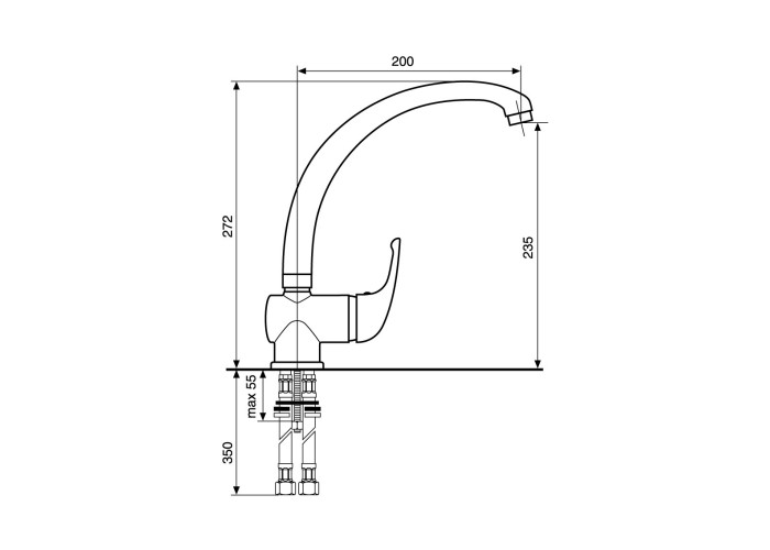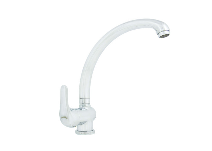 Представлений тут настільний, одноважільний, кухонний змішувач CR8077G серії Giglio від Emmevi зроблений із високоякісної латуні з покриттям кольору хрому, має довжину поворотного виливу 20 см. Модель встановлюється на один отвір використовуючи гнучкі шланги для підведення води М10*1/2″.